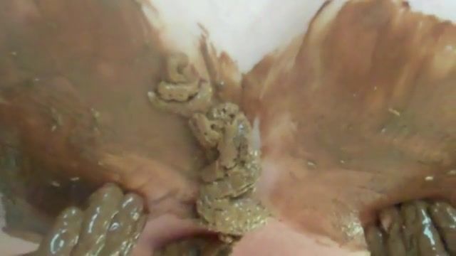 Younger couple are having fun in the bedroom. The girl sits naked on her back on the floor wihle the guy is pooping on her entire body…