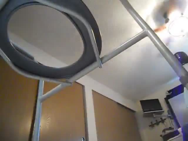 Amateur BBW babe sitting naked on a homemade toilet while she's pooping in the middle of the bedroom floor.