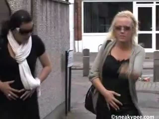 Two amateur girls pee in public place. They did that in same time, pulling their panties aside.