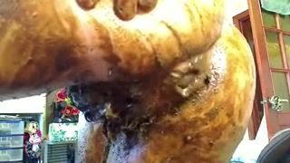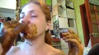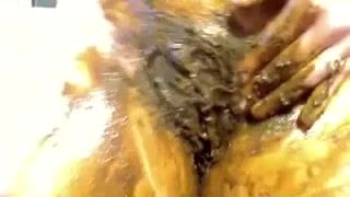 Amateur milf finished pooping on her own hands. She starts smearing that poop on her body as she's masturbating with it.