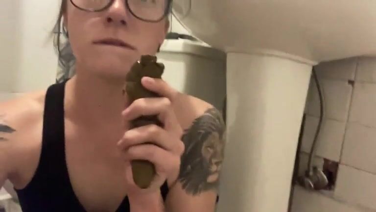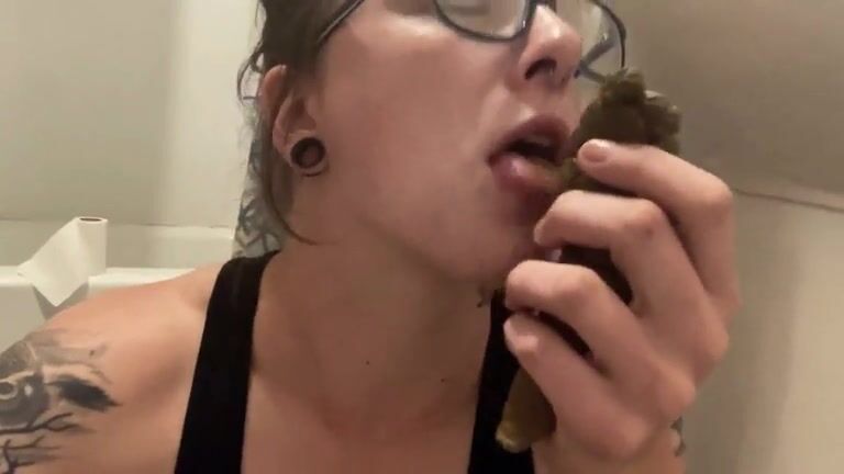 Amateur nerdy milf licking her big turd