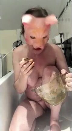 Pig masked busty swallows her own shit