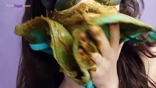 Amazing brunette covered her perfect body with fresh crap. She masturbates in unique way in front of the camera.