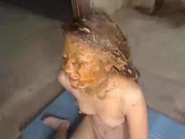 Brunette Asian girl sits on her back on the floor while a bunch of guys are pooping on her body and face. She's the real scat pig…