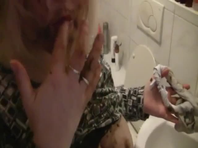 BBW blonde babe is eating fresh poop from her black messy panties. Awesome.