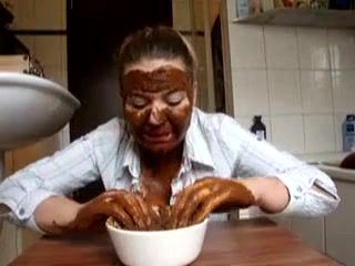 Brunette BBW girl smears saved shit on her face. She smears a bit on her tits too…I wonder how is the smell in that room…nice.