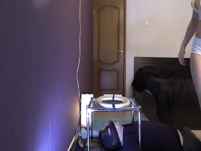 Blonde mistress sits half naked on a homemade toilet. She's pooping a lot on slave's face.