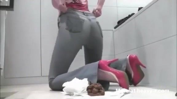 Beautiful teen sits half naked on her knees and she's pooping a lot on her knees.
