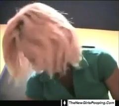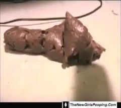 Hot babe is shitting a brown turd on the floor while she sits half naked on a homemade toilet.