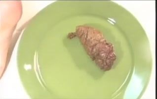 Brunette babe spreads her legs wide opened and she shits a big brown turd on green plate.