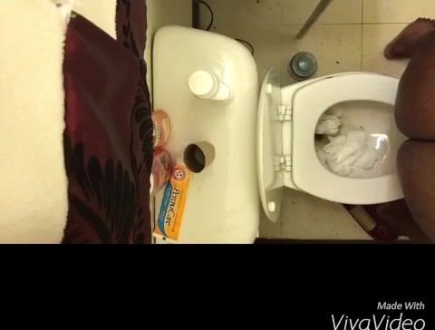 Black diva finished eating a big plate of pasta. She went to a public bathroom to poop a lot cause she ate to much.