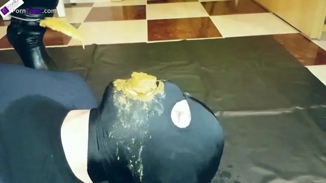 Blonde babe wearing black lingerie and she's feeding her boyfriend with a big pile of shit.