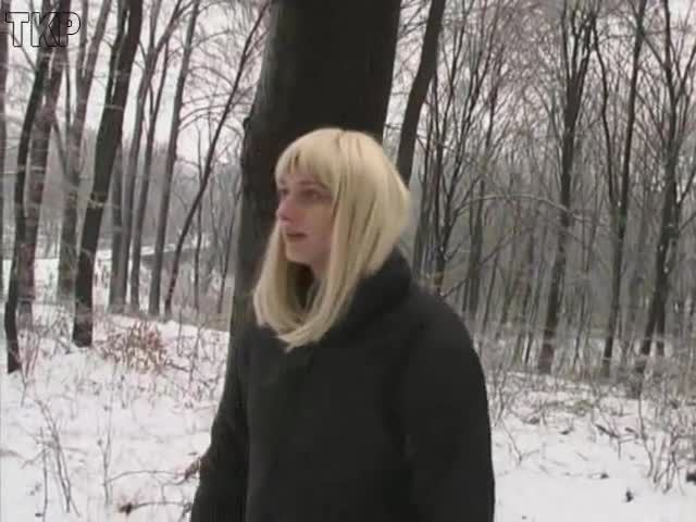 Blonde babe that's wearing black lingerie is peeing on the snow, outdoor. Awesome.