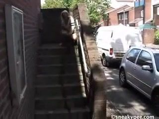 Blonde babe peeing with pressure on neighbours front porch. She slowly spreads her legs wide opened.