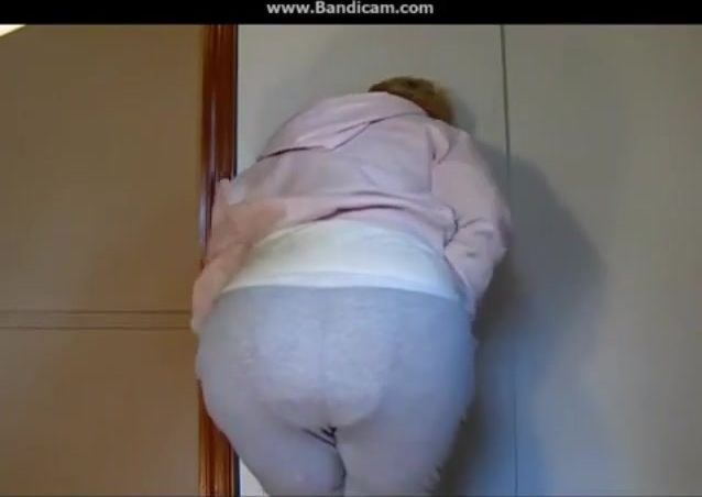 Chubby housewife shits a lot in white diapers. She's trying to shake her ass in front of the camera.
