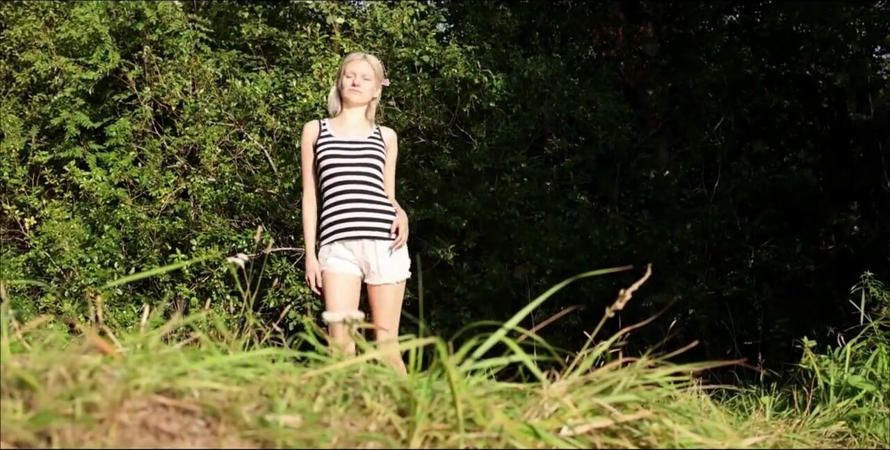 Blonde bends over and pee on the grass