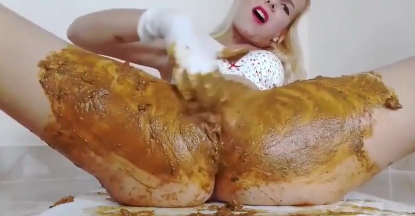 Beautiful blonde milf smears brown shit on her shaved pussy. She really knows how to masturbate while moaning.