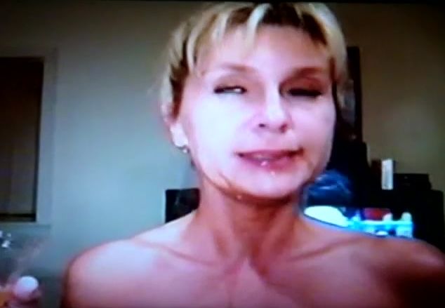 Blonde mature woman drinking fresh piss from a wine glass.