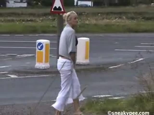 Blonde teen peeing near highway
