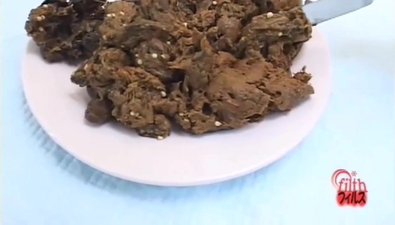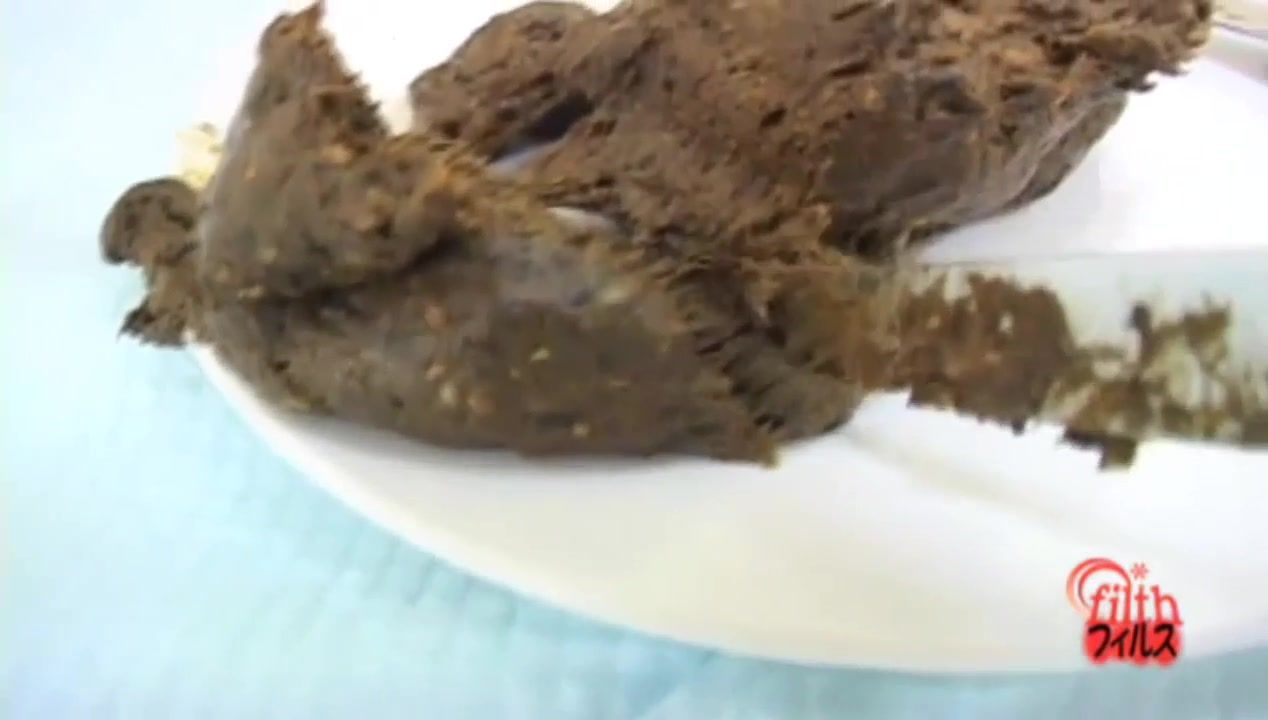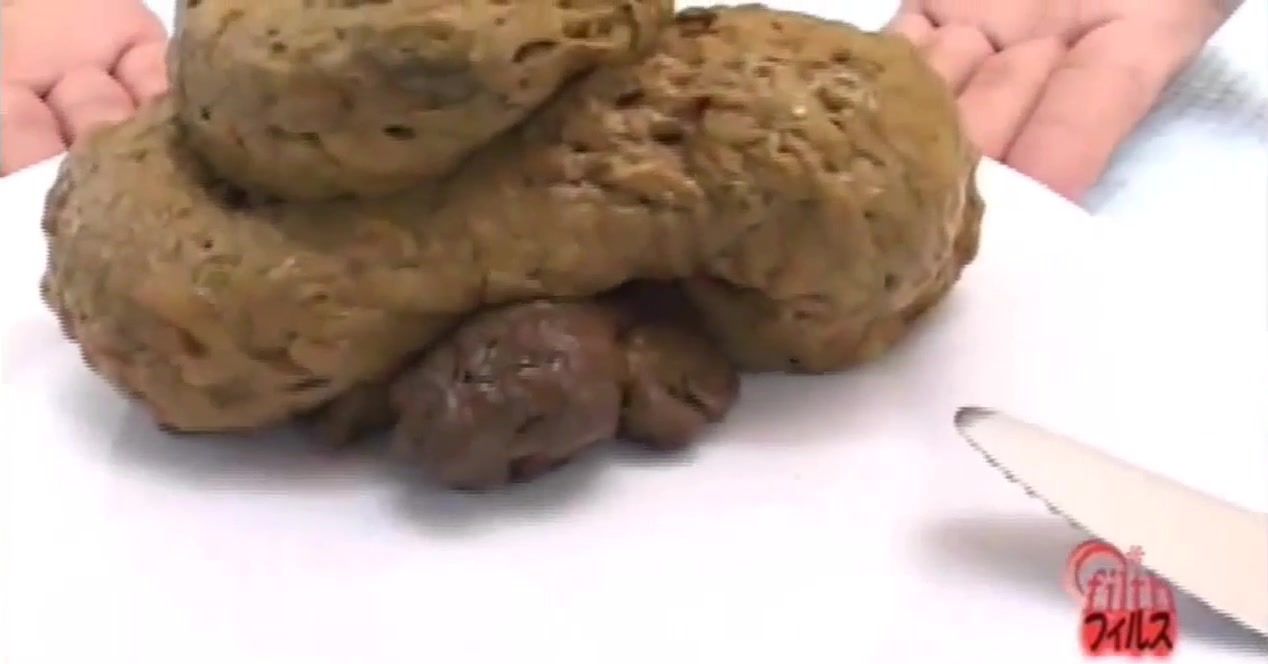 Brown haired japanese babe sits half naked on her knees and she shits a lot on a white plate.