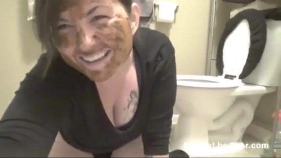 Brunette girl pooping in the bathroom and smearing it on her face