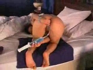 Brunette MILF sits on her knees, naked, while she inserts warm piss into her butthole.