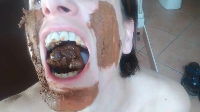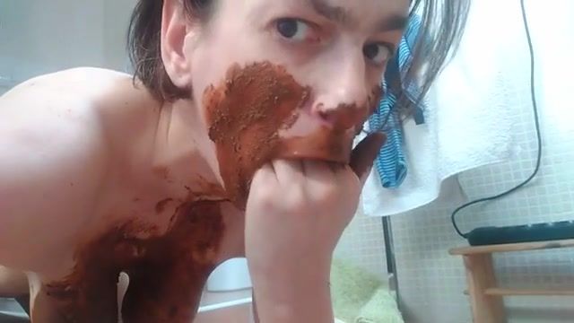 Brunette milf smears poop on her entire face. She's fingering her wet pussy in same time.