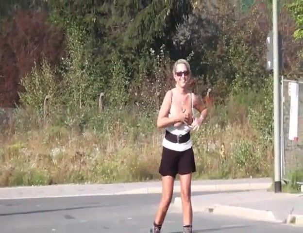 Busty blonde babe is peeing in public. She's teasing us with her big tits. Awesome.