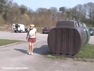 Busty blonde peeing outdoor