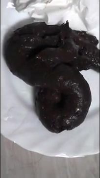 Busty brunette milf is playing with her pierced pussy while pooping a long turd on a white plate.