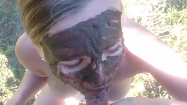 Busty slut covered with shit gives blowjob
