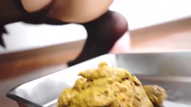 Woman shits on a pie pan on the floor
