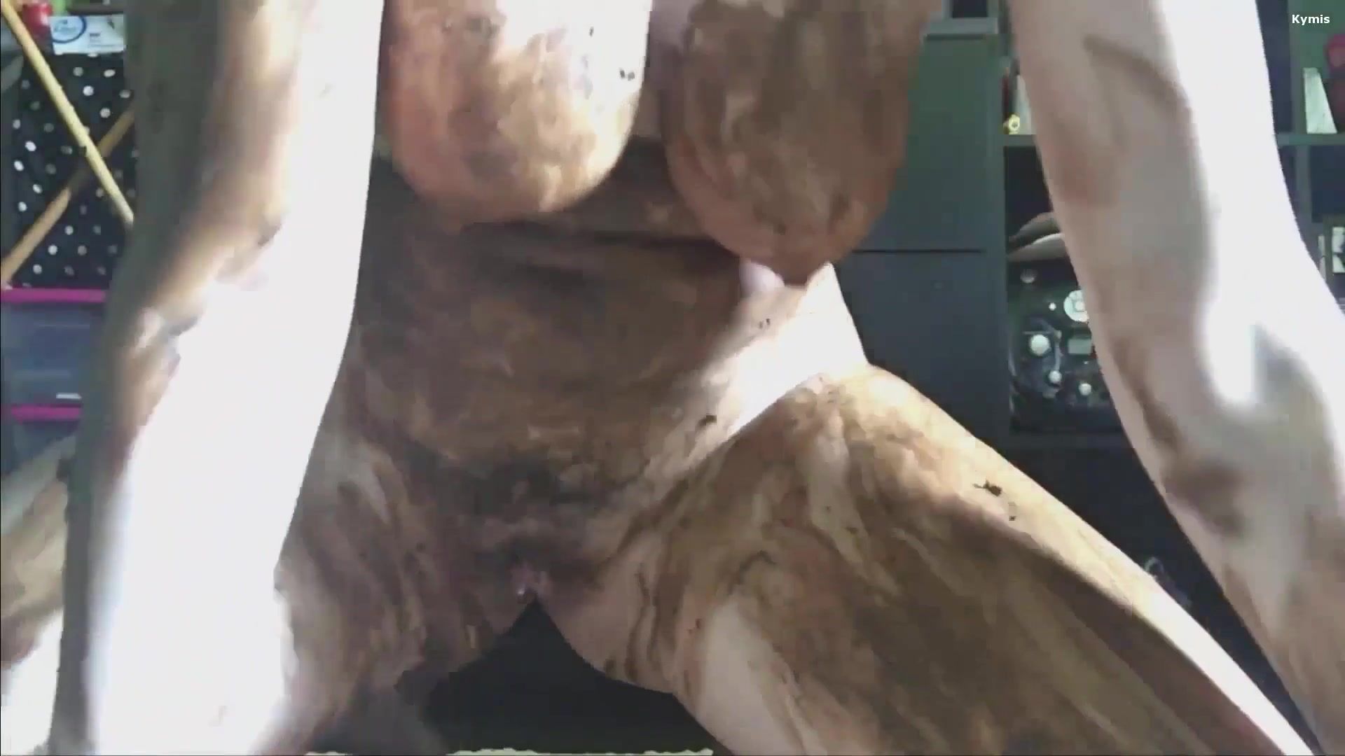 Chubby girl smears a lot of brown shit on her amazing body. She loevs playing with her big tits.