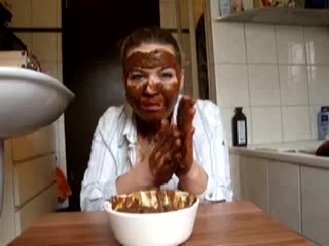 Chubby European girl smears fresh shit on her entire face. She did that while playing with her big boobies.