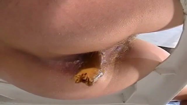 Close up of a beautiful amateur girl that's pooping while she sits naked on a homemade toilet.