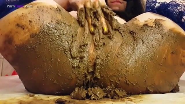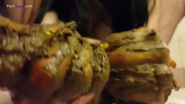 Dark haired college girl did a real mess. She covered her naked body with fresh shit. She's fisting her pussy until reaching climax.