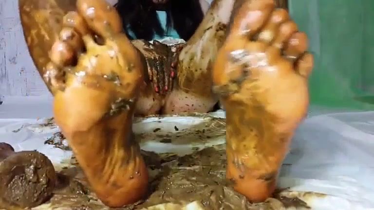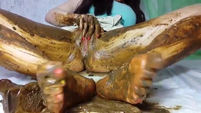 Dark haired college girl smears brown poop on entire body. She's amazing at masturbating with poop.