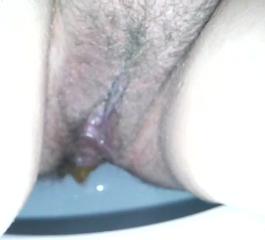 Creampied wife dropped a big turd over the toilet. She lets her husband to record her pussy in close up.
