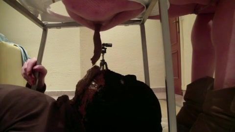Mature masked slave sits on the floor while his mistress is pooping into his opened mouth. He tried to swallow all that shit but he failed…