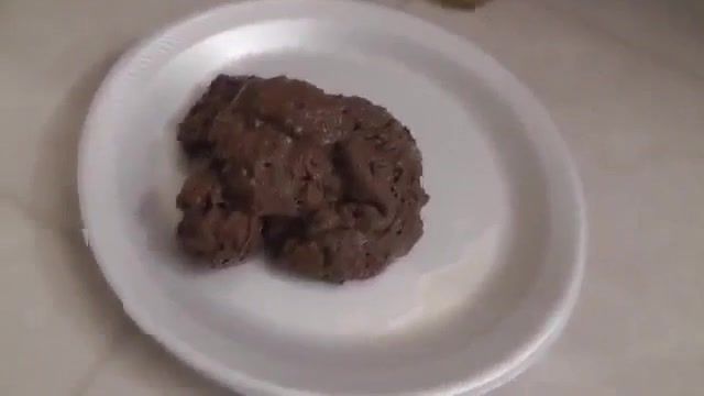 Girl with a big ass is pooping a big pile of creamy shit on a white plate.