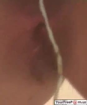 Cute blonde that's on her period is shitting on the bathroom floor. We can see a white tampon in her tight pussy.