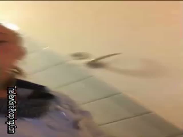 Blonde Danish girl pooping in reverse position. Sexy girl sitting half naked on her knees while taking a shit on bathroom floor.