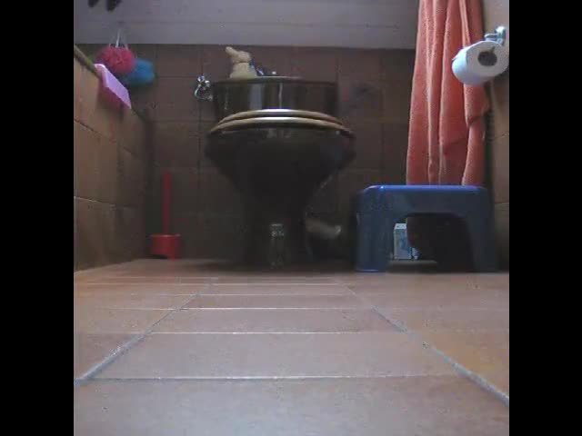 Dark haired girl sits half naked in doggy style position while she's pooping on bathroom floor.