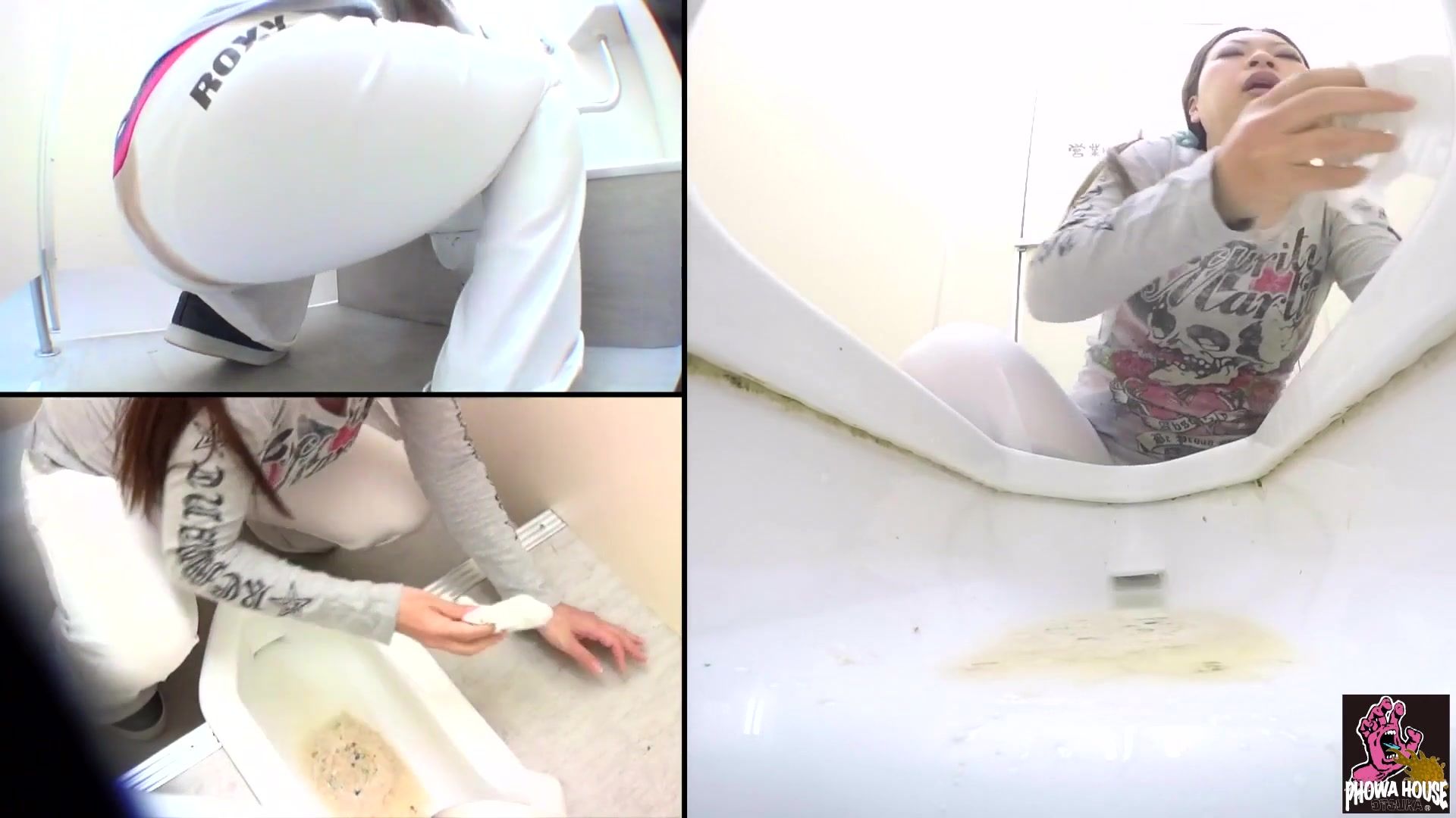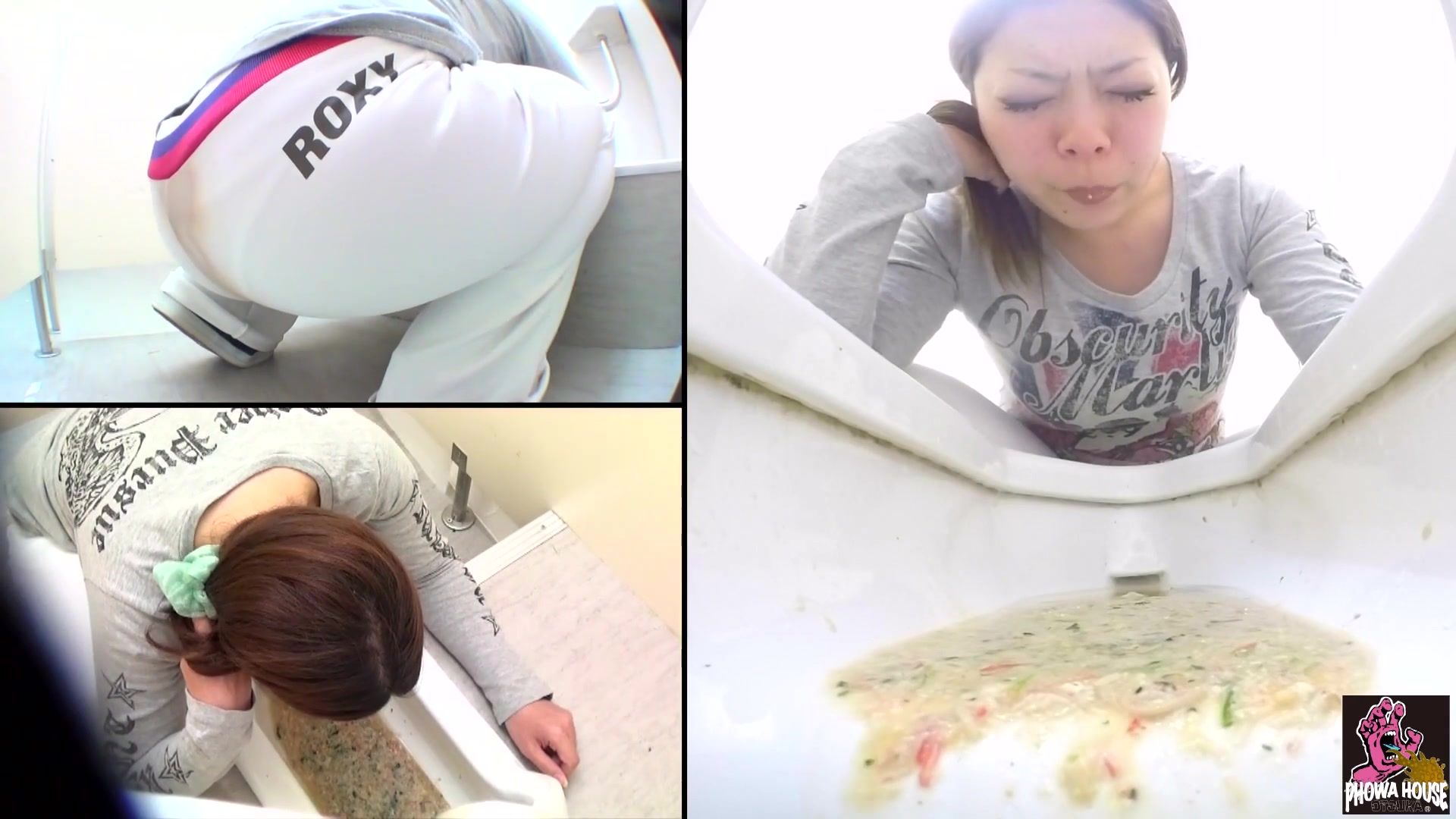 Two sexy Japanese girls ate bad food at lunch. Because of that they are going to puke and shit in public bathrooms.