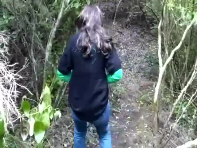 Mature blonde woman pooping liquid shit on the ground, in the middle of a big forest.
