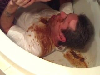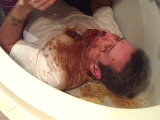 Amateur couple are pooping on each other in bathtub. His naughty wife dropped liquid shit on his entire face.