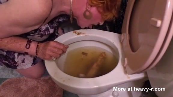 Chubby grandma decided to drink a mix of liquid shit from toilet while using a dildo to penetrate her ass and pussy.