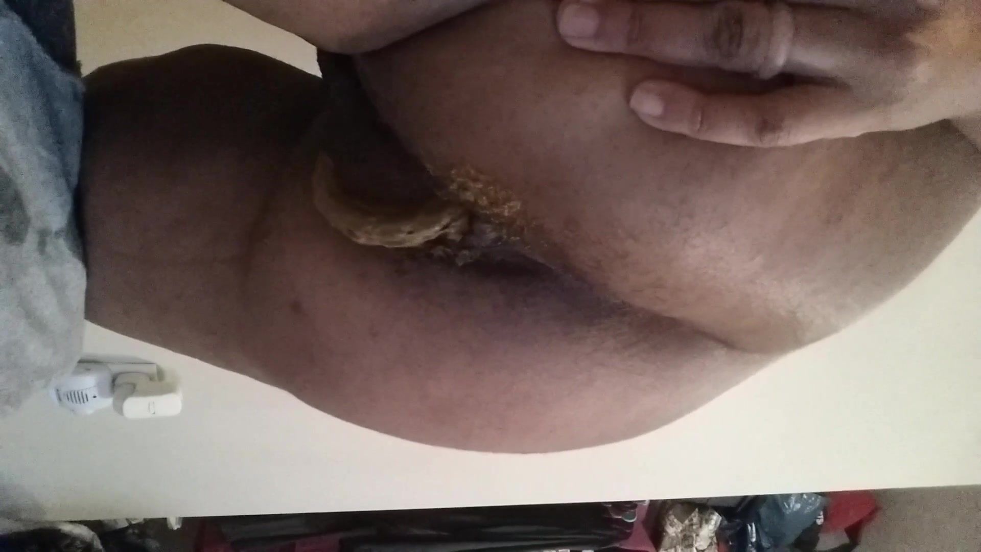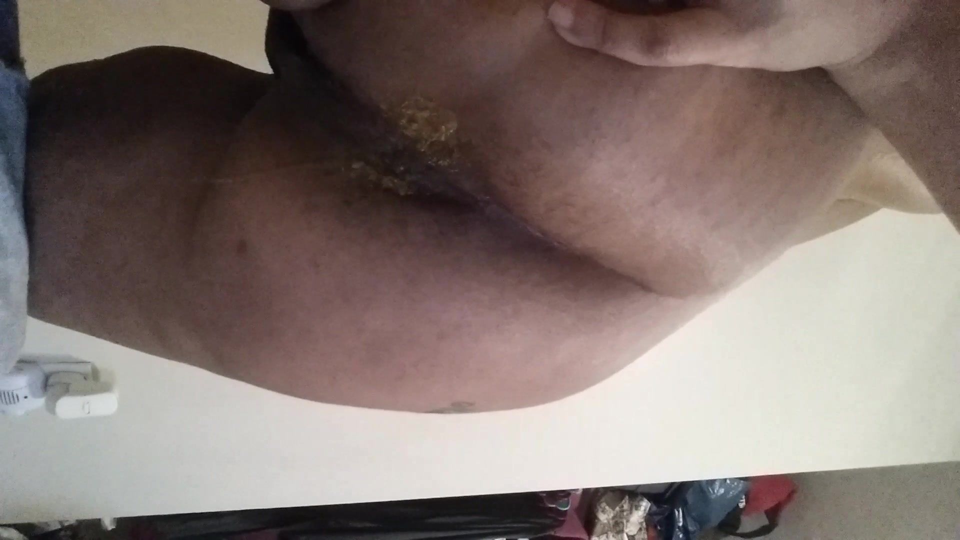 Ebony girl did a real mess on bathroom floor. She slaps her ass hard.