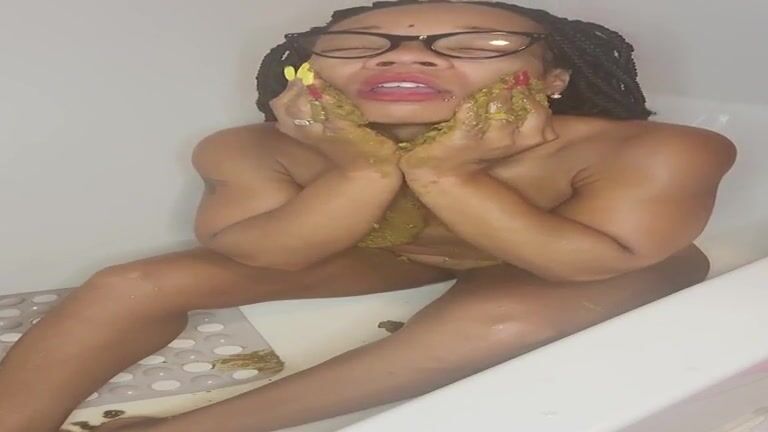 Ebony MILF rubbing shit on her body and face