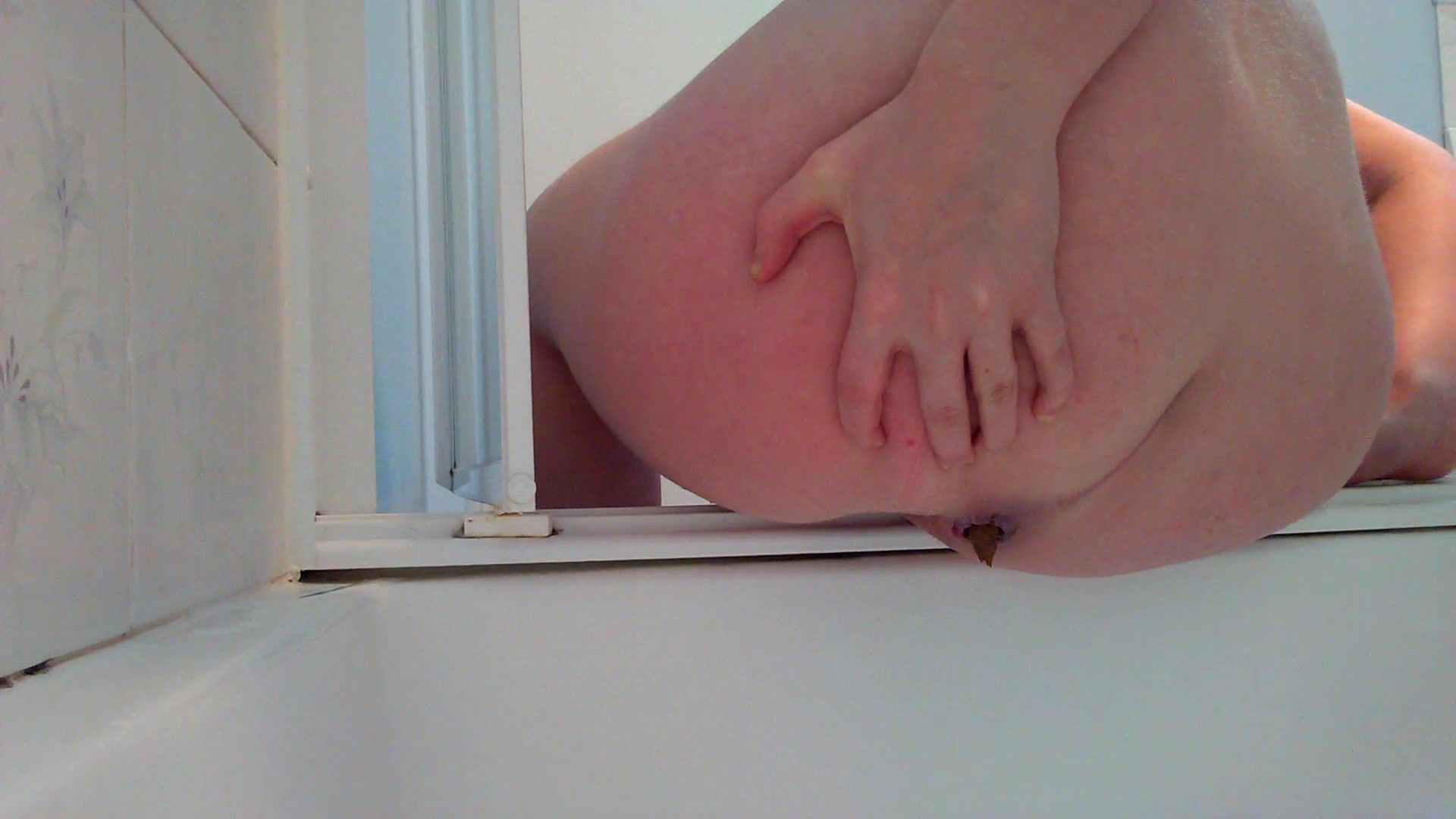 Fat wife spreads her butt cheeks wide opened and she's pooping a lot in the bathtub.
